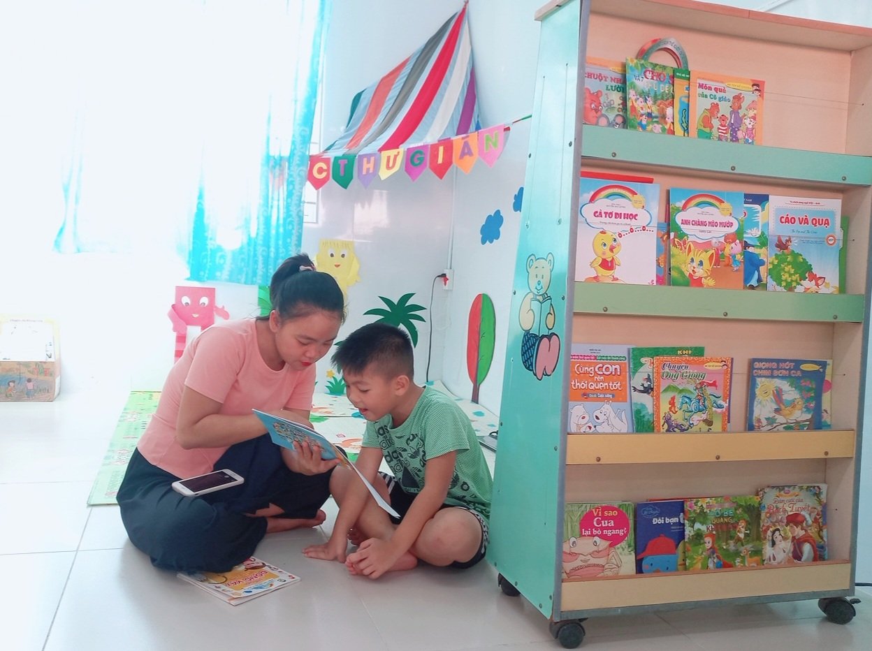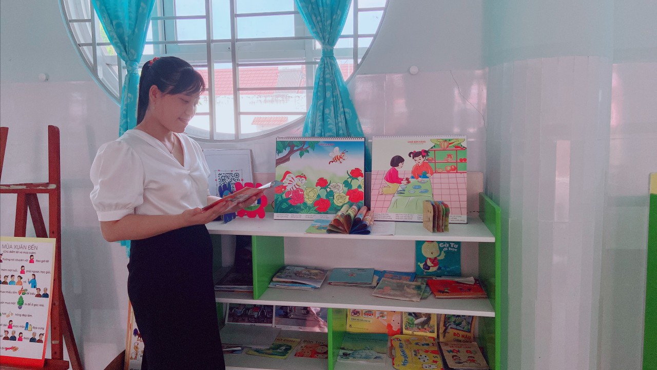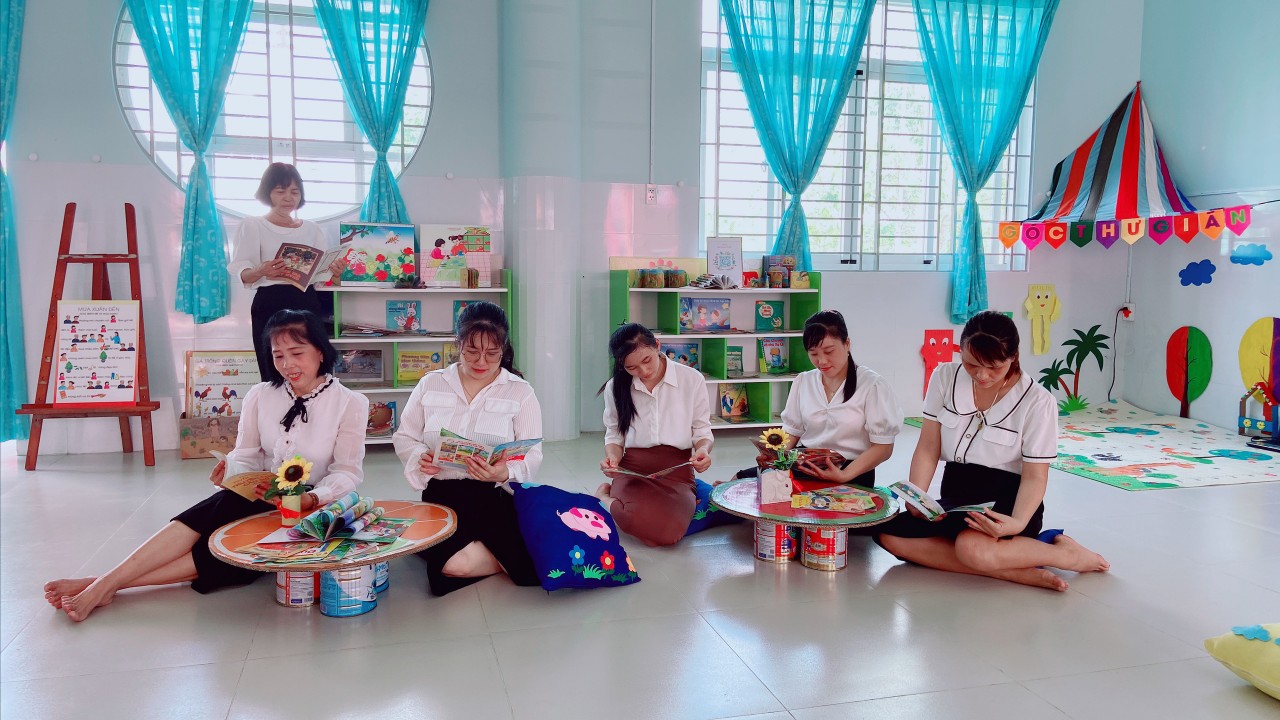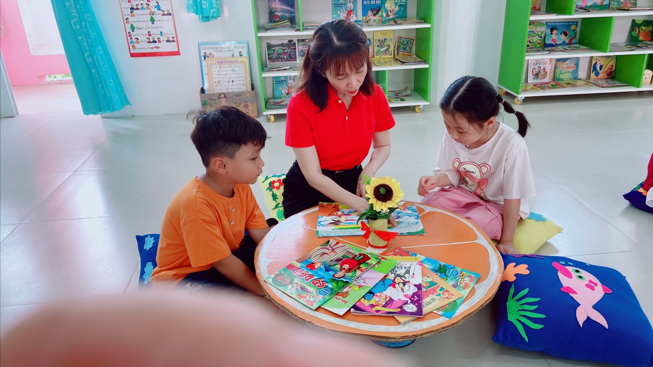 Góc thư viện của nhà trường được bố trí theo không gian mở, thân thiện, hài hòa với trẻ. Các loại sách, truyện được trưng bày trên kệ, trẻ có thể dễ dàng tiếp cận, lựa chọn sách, truyện phù hợp với nhu cầu đọc và tự lấy được sách để đọc theo ý thích của mình. Thư viện còn bố trí các góc như: “ góc thư giãn”, “góc kể chuyện”, “góc tạo ambum”. Các góc được trang trí, với những bức họa vui nhộn, bắt mắt xung quanh tạo thân thiện với môi trường, giúp giảm căng thẳng, kích thích nhu cầu đọc cho trẻ. Nhằm tạo cơ hội cho trẻ được khám phá, tìm tòi, phát triển khả năng sáng tạo, giúp trẻ phát triển nhận thức, tạo cơ hội cho trẻ tiếp cận sách báo, tranh ảnh, hình ảnh qua các con vật sự vật, hiện tượng xung quanh.Với mong muốn mang lại cho trẻ những cơ hội khám phá thể hiện bản thân, truyền đến trẻ tình yêu với sách, thường xuyên thay đổi và làm mới các đầu sách tạo cho trẻ hứng thú mỗi khi đến trải nghiệm và cũng là nơi thư giãn của trẻ