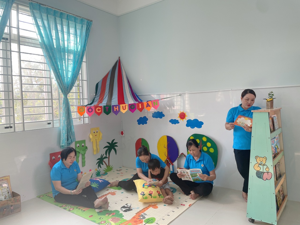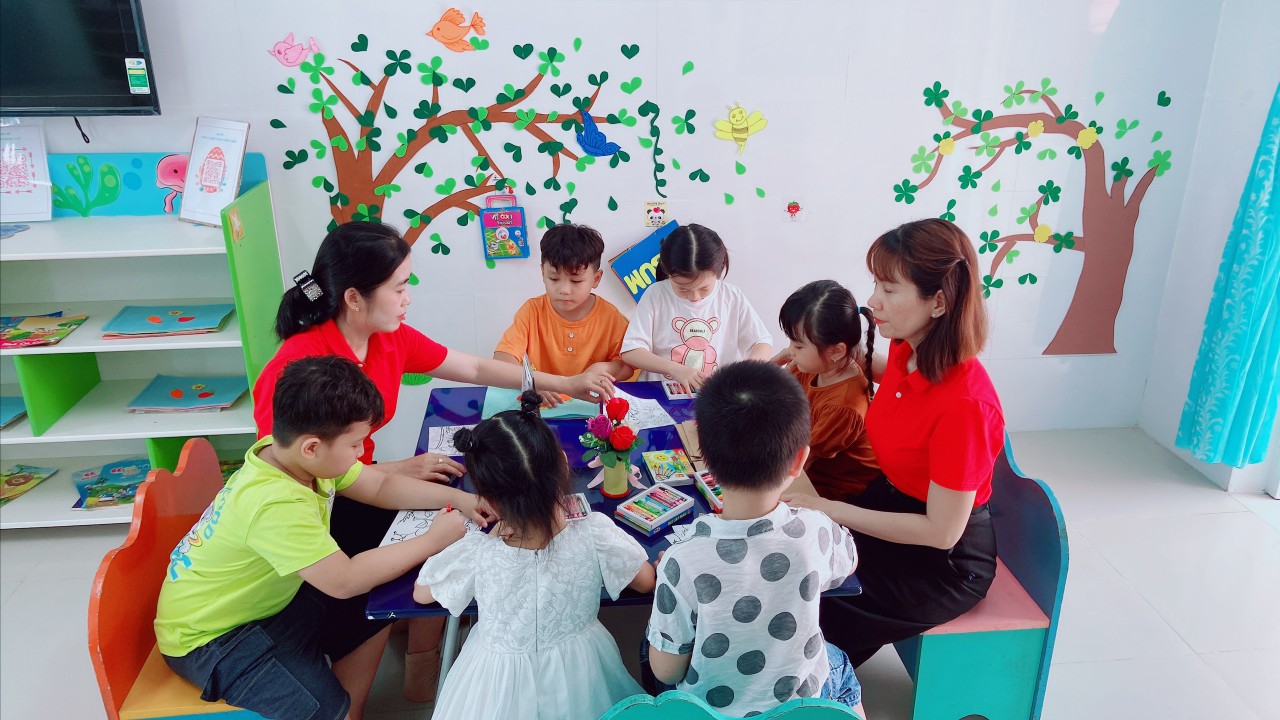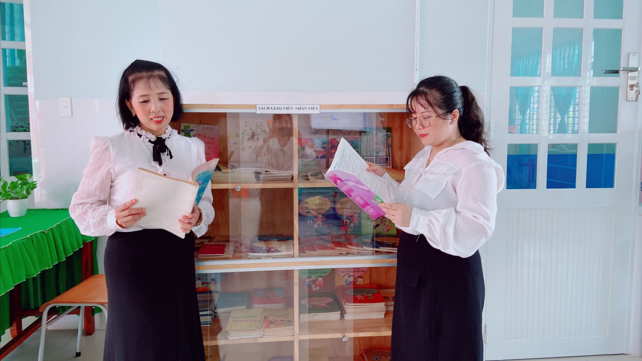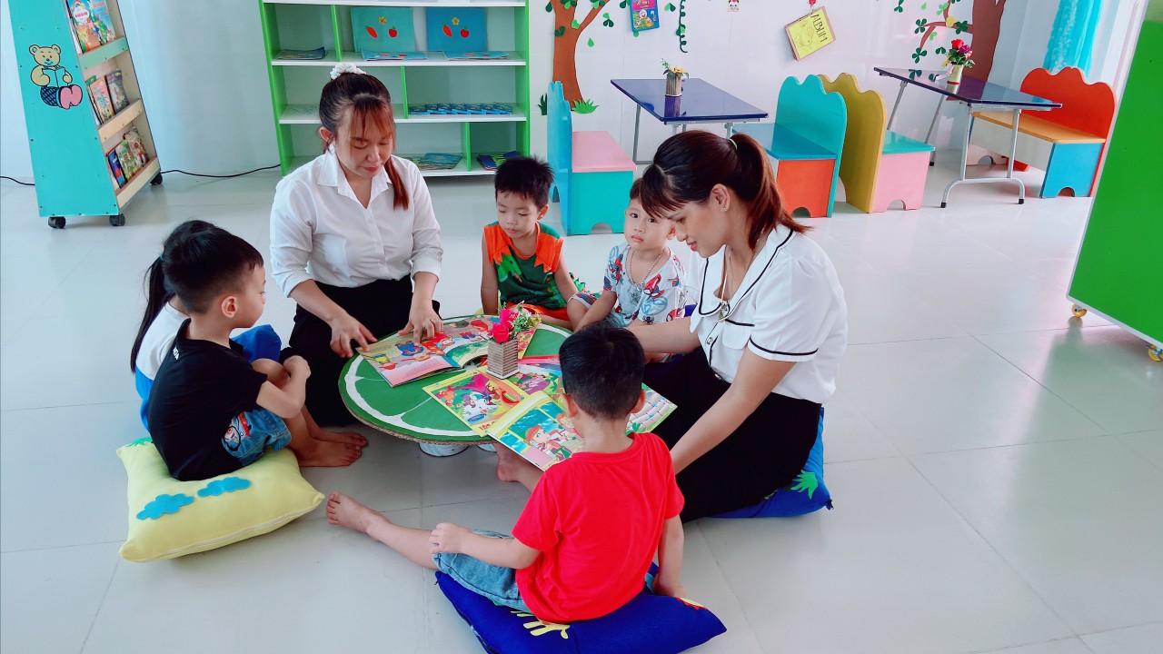 Góc thư viện của nhà trường được bố trí theo không gian mở, thân thiện, hài hòa với trẻ. Các loại sách, truyện được trưng bày trên kệ, trẻ có thể dễ dàng tiếp cận, lựa chọn sách, truyện phù hợp với nhu cầu đọc và tự lấy được sách để đọc theo ý thích của mình. Thư viện còn bố trí các góc như: “ góc thư giãn”, “góc kể chuyện”, “góc tạo ambum”. Các góc được trang trí, với những bức họa vui nhộn, bắt mắt xung quanh tạo thân thiện với môi trường, giúp giảm căng thẳng, kích thích nhu cầu đọc cho trẻ. Nhằm tạo cơ hội cho trẻ được khám phá, tìm tòi, phát triển khả năng sáng tạo, giúp trẻ phát triển nhận thức, tạo cơ hội cho trẻ tiếp cận sách báo, tranh ảnh, hình ảnh qua các con vật sự vật, hiện tượng xung quanh.Với mong muốn mang lại cho trẻ những cơ hội khám phá thể hiện bản thân, truyền đến trẻ tình yêu với sách, thường xuyên thay đổi và làm mới các đầu sách tạo cho trẻ hứng thú mỗi khi đến trải nghiệm và cũng là nơi thư giãn của trẻ