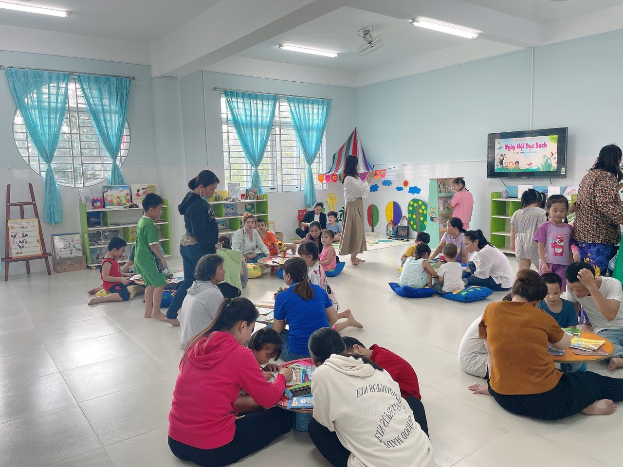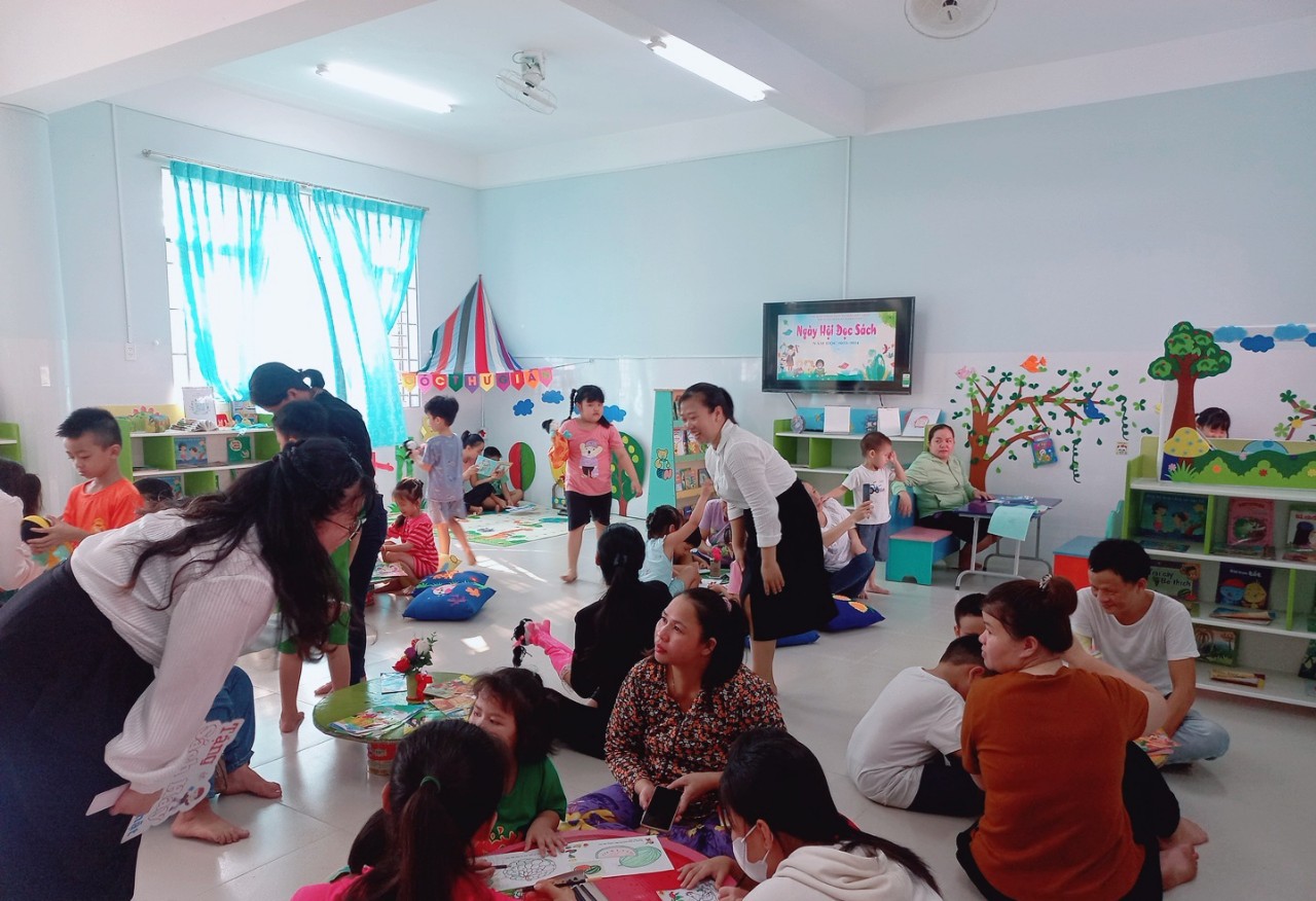 “ Ngày Hội Đọc Sách” đã thu hút được đông đảo trẻ , phụ huynh và giáo viên- nhân viên nhà trường tham gia với nhiều hoạt động đọc sách thiết thực phong phú như: Cô hướng dẫn trẻ đọc, trẻ đọc theo nhóm, ba mẹ cùng trẻ xem tranh và những cuốn truyện phù hợp độ tuổi, ba mẹ cùng trẻ làm allbum về câu chuyện, ba mẹ cùng trẻ chơi kể kể bằng rối tay, rối ngón tay.